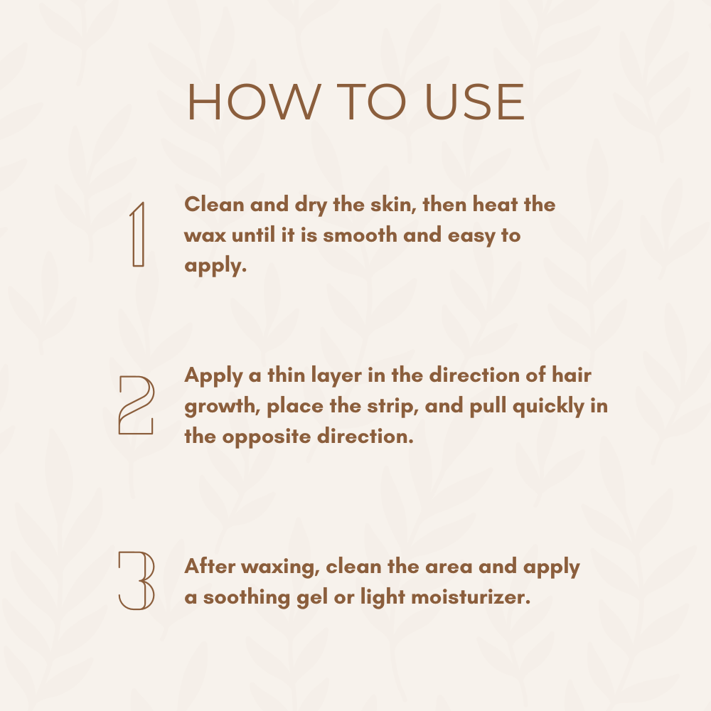 Heat: Heat the wax until it reaches a smooth consistency. Always test the temperature on a small patch of skin first.